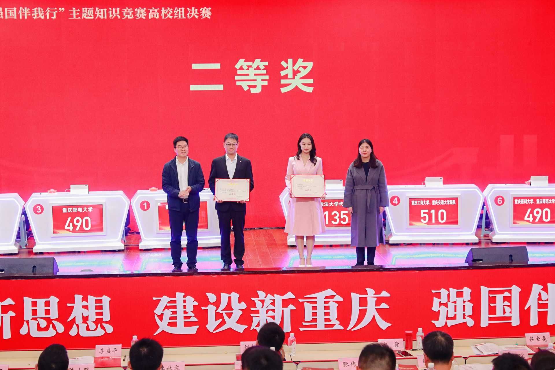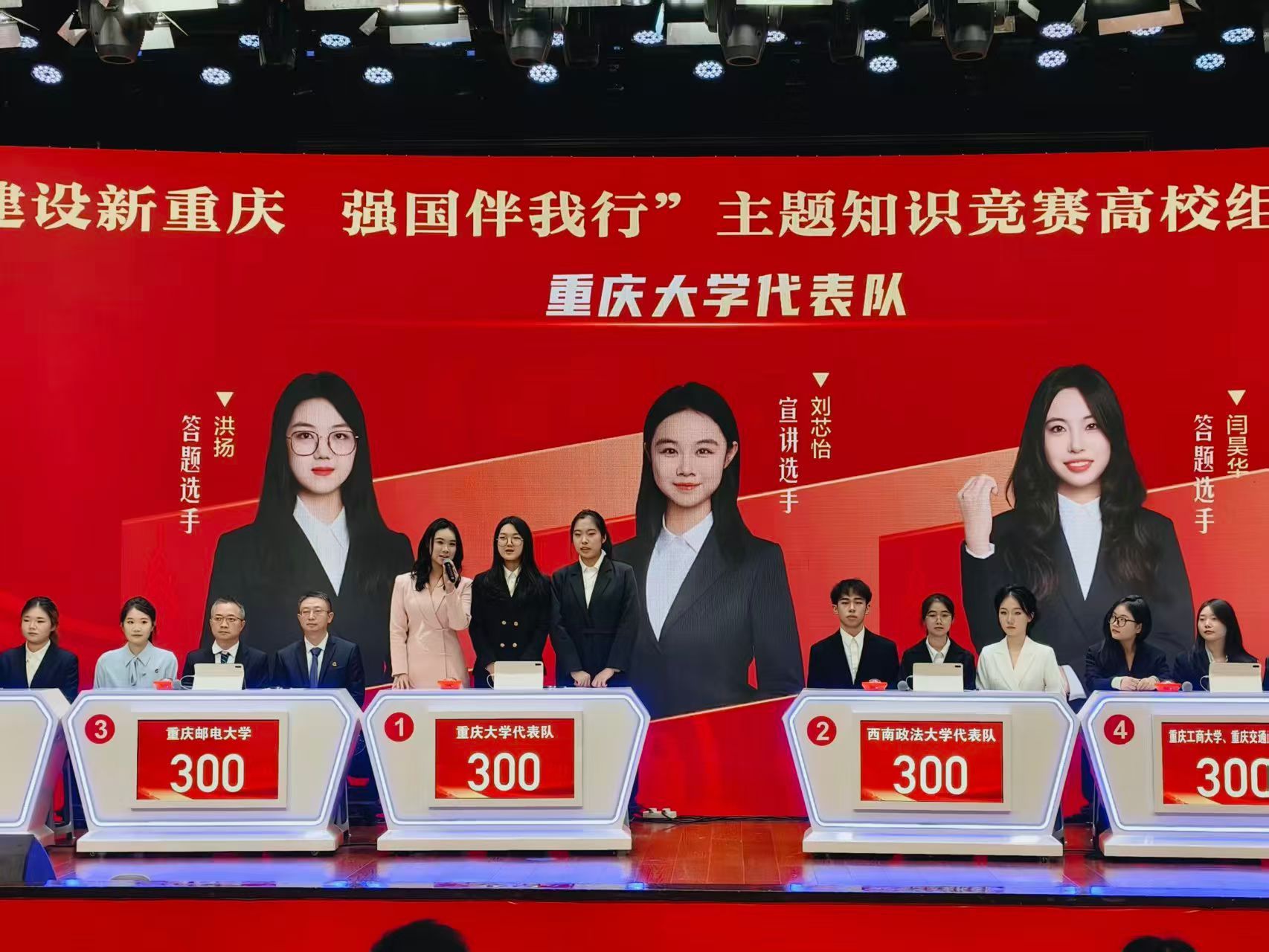 2025年11月14日,由重庆市教委主办、西南政法大学承办的“学习新思想 建设新重庆 强国伴我行”主题知识竞赛高校组决赛在西南政法大学渝北校区圆满落幕。来自全市12所高校的8支代表队同台竞技,经过激烈角逐,重庆大学代表队凭借扎实的理论功底和出色的团队协作,荣获第三名并斩获二等奖,展现了重大学子深学笃行的精神风貌。